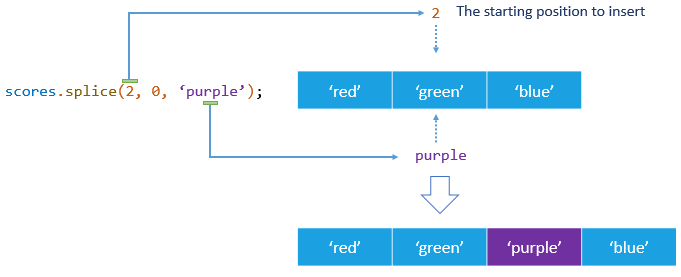 Rysunek przedstawia wywołanie metody colors.splice(2, 0, 'purple') z przykładu.