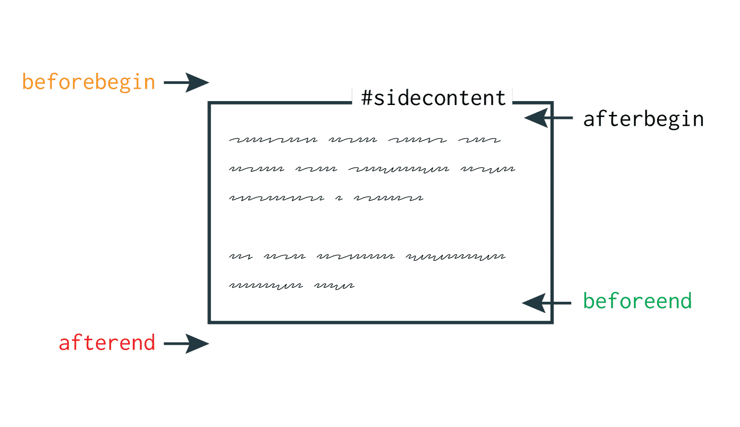 Nowoczesna metoda dodawania ciągu znaków z tagami HTML przed, po lub wewnątrz elementu. Rozwiązuje problem innerHTML z ponownym serializowaniem zawartości elementu podczas dodawania znaczników do istniejących.