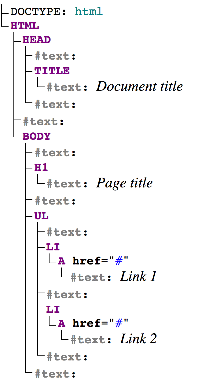 Zgodnie z modelem DOM każdy tag tworzy osobny element (węzeł), każdy fragment tekstu - element tekstowy. Dokument HTML to drzewo hierarchiczne, w którym każdy element (z wyjątkiem "korzeniowego" root) ma tylko jednego rodzica, czyli element, w którym się znajduje. To drzewo składa się z zagnieżdżonej struktury tagów i elementów tekstowych.
