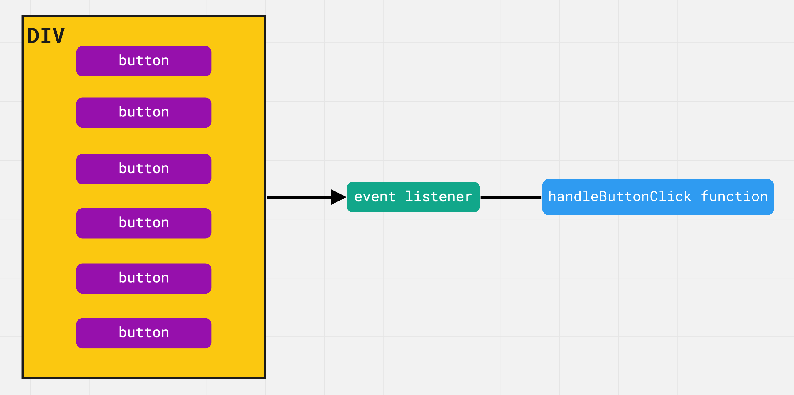 Problem polega na tym, że mamy 100 słuchaczy zdarzeń. Wszystkie wskazują na tę samą funkcję, ale samych handlerów jest 100. Co jeśli przeniesiemy wszystkich słuchaczy do wspólnego przodka, elementu <div>?