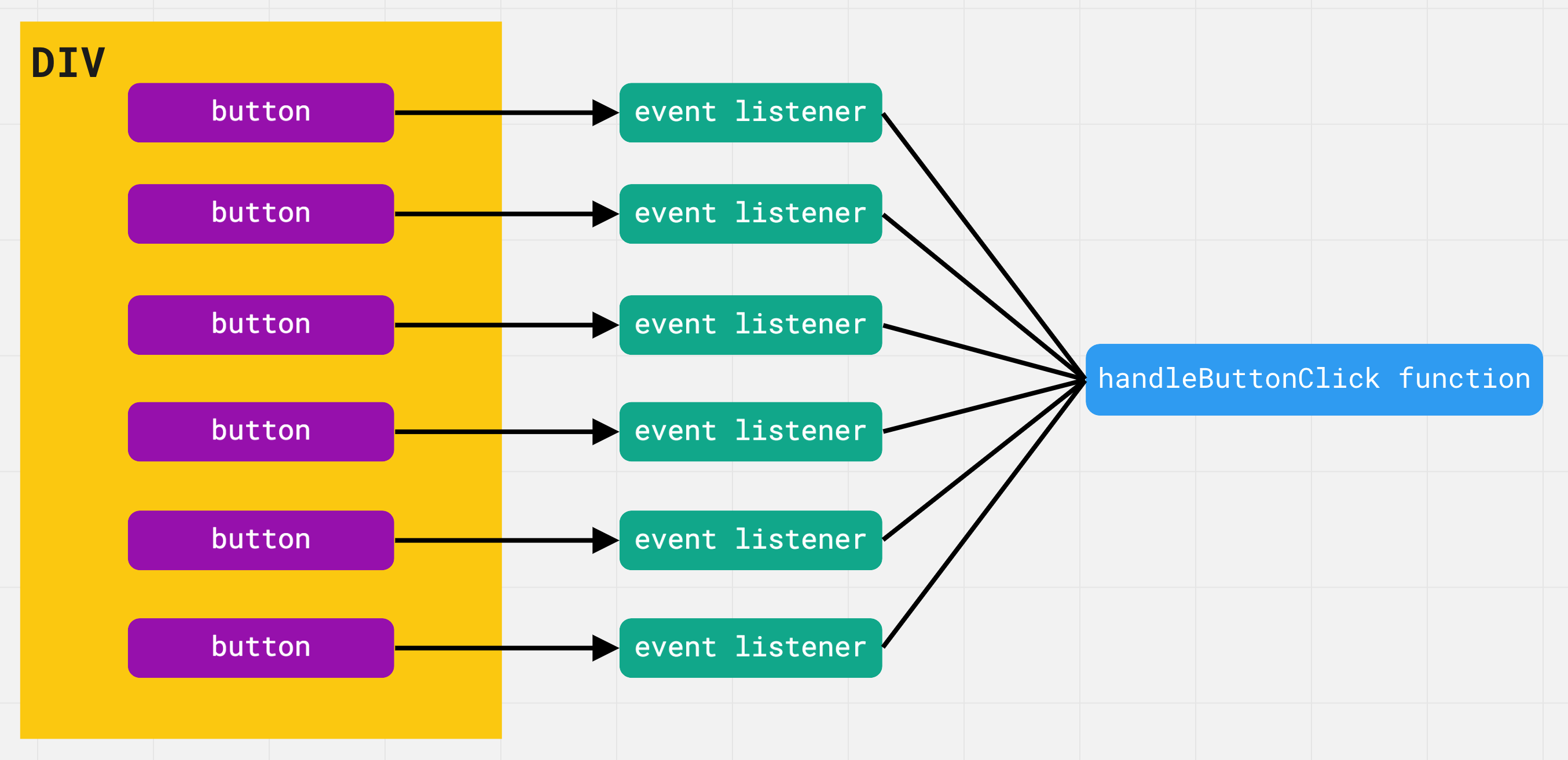 Spójrzmy na delegację na przykładzie. Utwórzmy element <div>, dodajmy do niego dowolną liczbę przycisków, na przykład 100, i zarejestrujmy każdy z nich za pomocą detektora zdarzeń kliknięcia z funkcją handleButtonClick.
