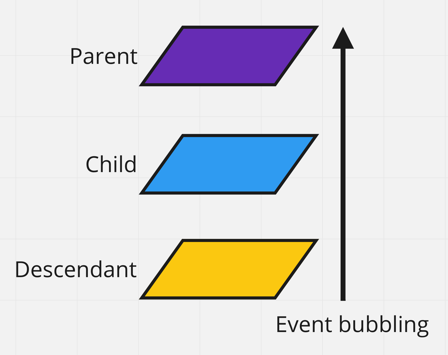 Bąbelkowanie sprawia, że kliknięcie na element #descendant wywoła obsługę kliknięcia, jeśli taka istnieje, najpierw na samym #descendant, potem na elemencie #child, potem na elemencie #parent i tak dalej w górę łańcucha przodków aż do window