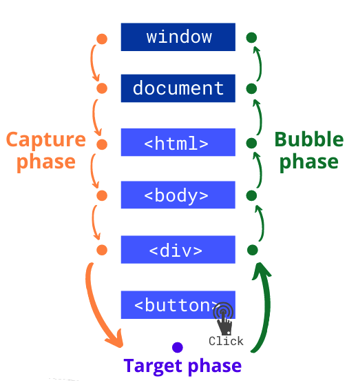 - Capturing phase (przechwytywanie) - zdarzenie rozpoczyna swój cykl życia w window i "opada" (przechodzi przez wszystkie elementy przodków) do najgłębszego elementu docelowego, na którym nastąpiła akcja, np. kliknięcie.