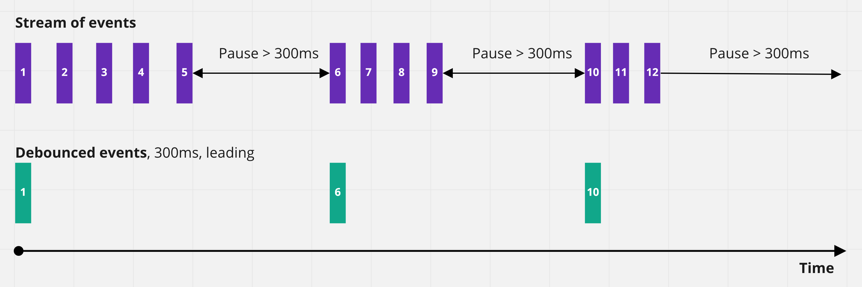 Są jednak zadania, w których funkcję trzeba wywołać natychmiast po wystąpieniu pierwszego zdarzenia w strumieniu, a następnie zignorować wszystkie kolejne zdarzenia, aż do odpowiednio długiej przerwy między nimi, na przykład 300 milisekund. To zachowanie jest powtarzane na początku następnego strumienia zdarzeń. Ten tryb nazywa się leading edge (na początku).
