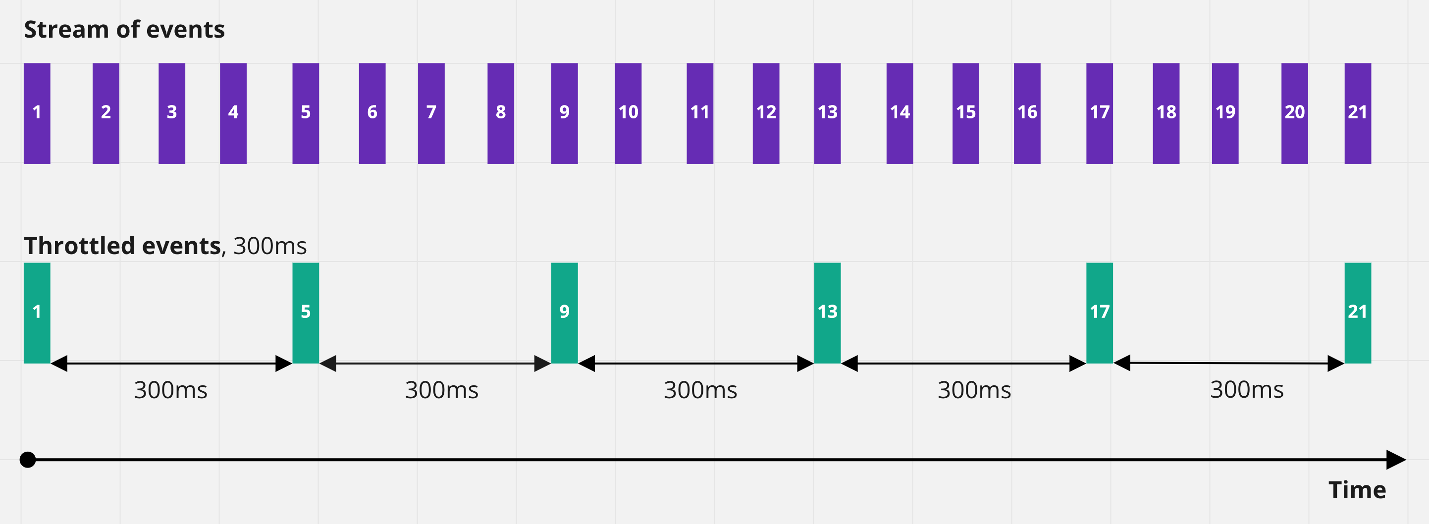 Używając throttle nie mamy kontroli nad tym, jak często przeglądarka uruchamia zdarzenia. Po prostu przejmujemy kontrolę nad tym, jak często wykonywana jest funkcja obsługi zdarzeń, niezależnie od tego ile wywołań się pojawi.