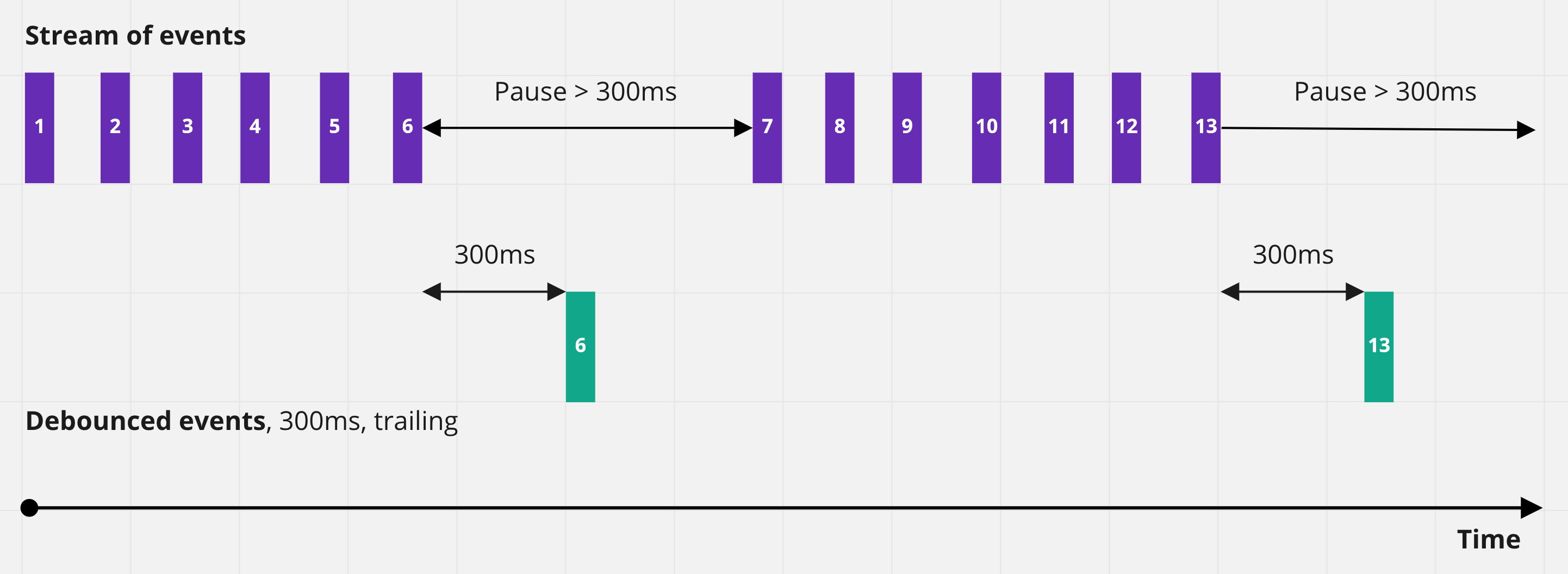 Domyślnie metoda debounce działa w trybie, w którym funkcja jest wywoływana w ciągu N milisekund po przerwie między "strumieniami" zdarzeń. Ten tryb nazywa się trailing edge (na końcu).