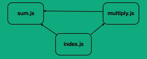 Załóżmy, że kod z sum.js jest używany w multiply.js i index.js, a kod z multiply.js jest używany tylko w index.js. Pokażmy hierarchię zależności na prostym diagramie.