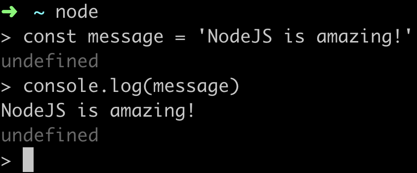 Node.js umożliwia uruchamianie kodu JavaScript poza przeglądarką. Otwórz dowolny terminal i wykonaj polecenie node, uruchomi się REPL (read-eval-print loop) - interaktywne środowisko uruchomieniowe kodu JS. Użyjmy go do wyprowadzenia czegoś do konsoli.