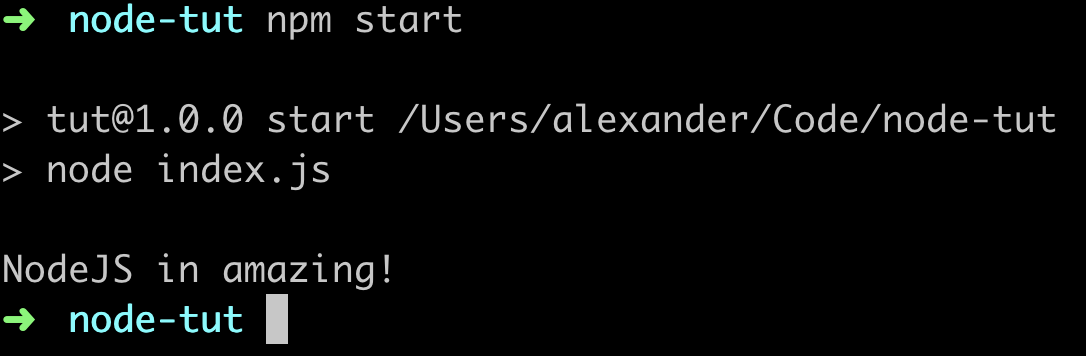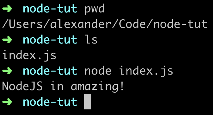 Teraz stwórzmy folder node-tut, a w nim plik index.js z kodem, który napisaliśmy w REPL. Aby uruchomić ten plik, musisz otworzyć terminal i przejść do folderu node-tut, który zawiera index.js o treści: