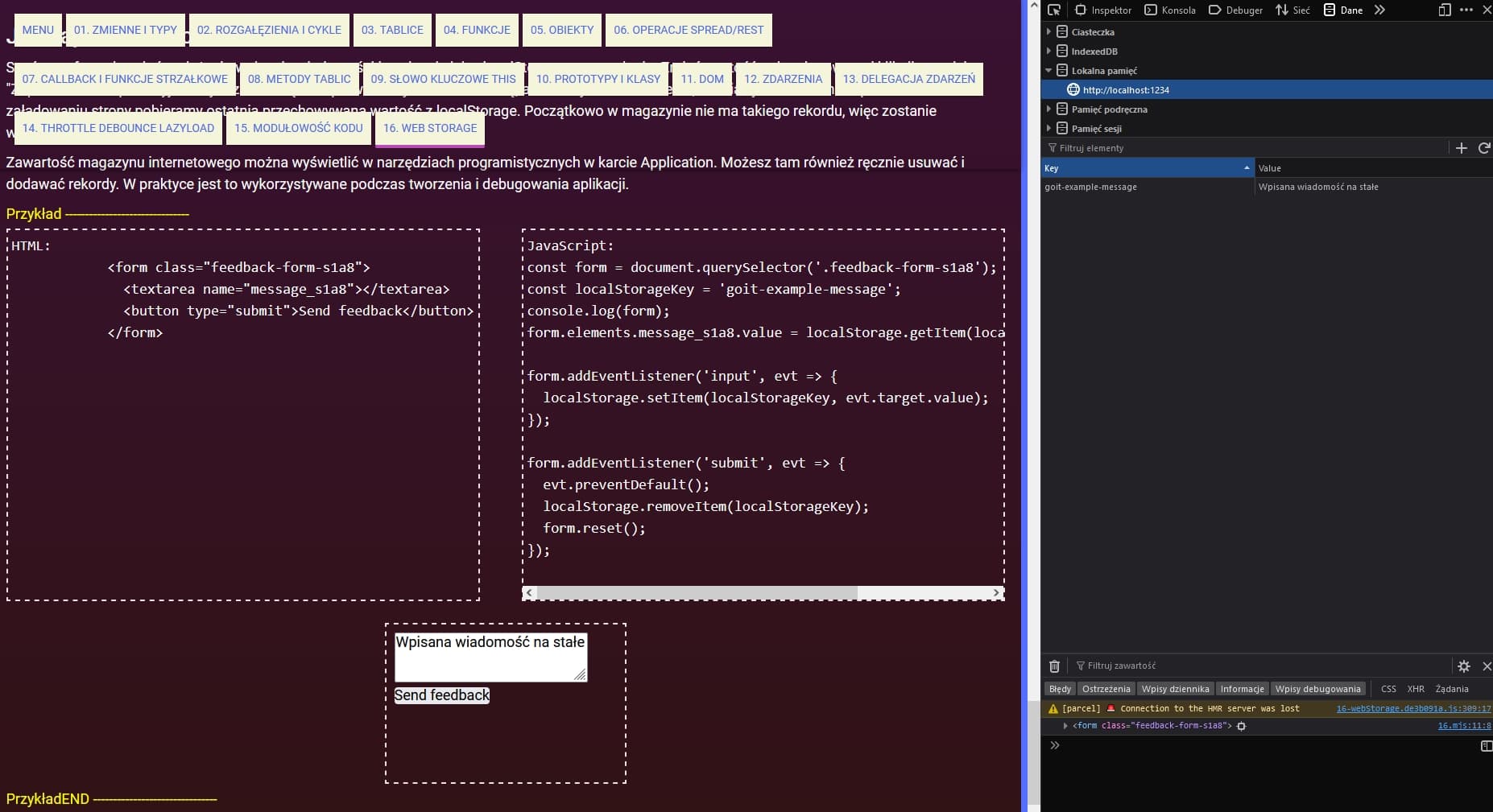 Magazyn internetowy składa się z magazynu lokalnego (localStorage) i magazynu sesji (sessionStorage). Zapewnia sposób przechowywania danych w dosyć intuicyjny sposób, mianowicie w postaci par klucz:wartość. Z technicznego punktu widzenia w magazynie internetowym można zapisywać tylko strings, ale nie stanowi to problemu, jeśli używasz metod klasy JSON do konwersji typów złożonych na wiersze. Nie ma sensu zapisywać metod obiektowych czy funkcji, wystarczą nam same dane.