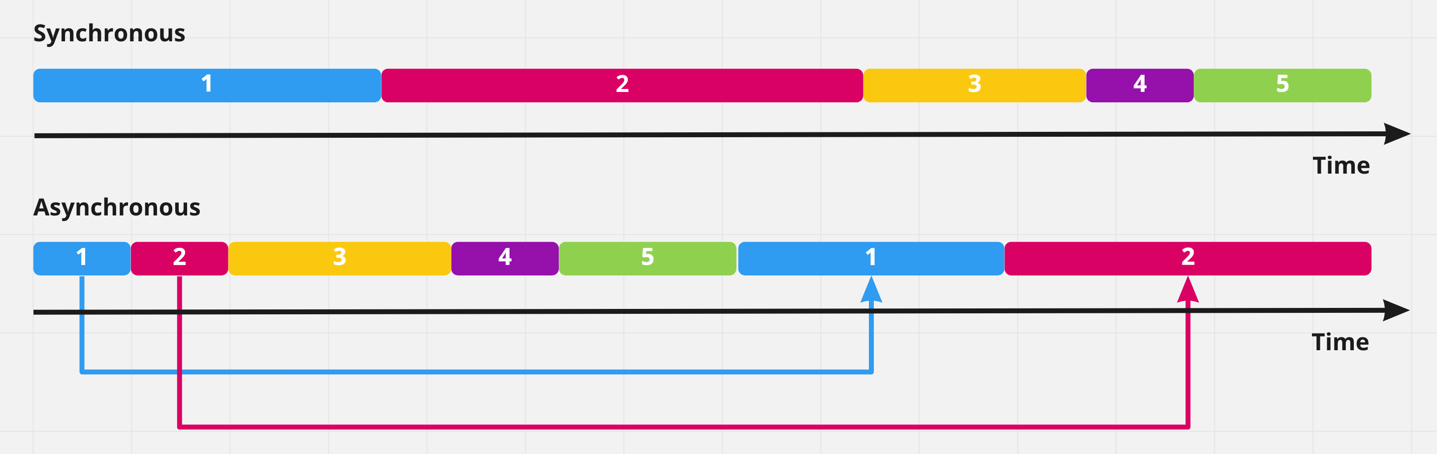Rozważmy różnicę w przykładzie, w którym program wysyła do serwera dwa żądania sieciowe, a następnie przetwarza ich wynik. Operacje 1 i 2 to funkcje, które wysyłają żądania do serwera, a 3,4 i 5 to dowolny inny synchroniczny kod, który znasz.