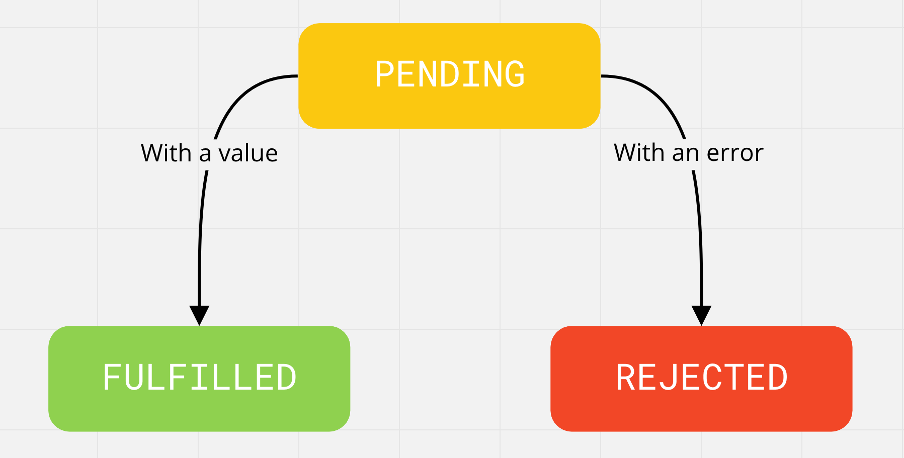 Kiedy obietnica jest tworzona, jest w stanie oczekującym (pending), po czym może zakończyć się pomyślnie (fulfilled), zwracając wynik (wartość) lub z błędem (rejected), zwracając przyczynę. Kiedy obietnica wchodzi w stan fulfilled lub rejected, jest to jej ostateczny stan i już się nie zmieni.