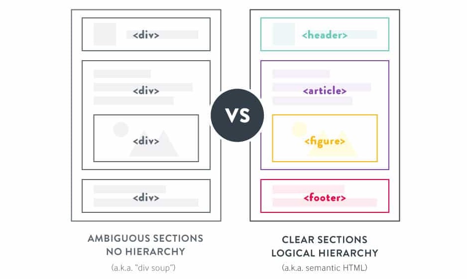Istnieje cały zestaw znaczników semantycznych do oznaczania dużych sekcji logicznych i ulepszania semantyki strukturalnej strony. Każdy z nich może być użyty pod pewnymi warunkami. Wpływa to na działanie technologii asystujących, indeksowanie strony i jej ranking w wynikach wyszukiwania.