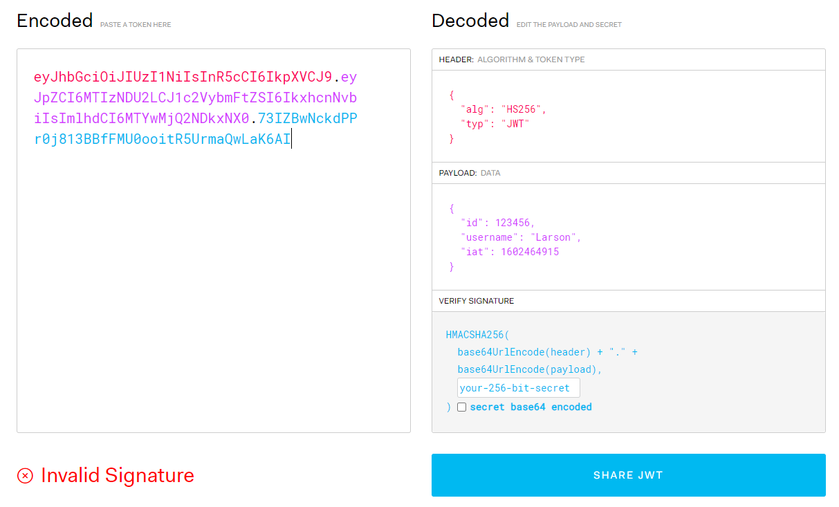 { id: 123456, username: 'Larson', iat: 1602465494 }