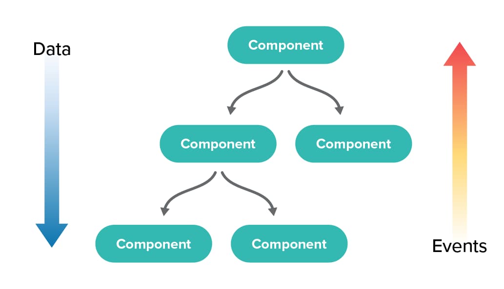 Stan należy do komponentu klasowego i można go zmienić tylko za pomocą metod zdefiniowanych w obrębie klasy. Zmiana stanu komponentu nigdy nie aktualizuje jego rodzica i sąsiadów. Aktualizacji podlegają natomiast wszystkie elementy dzieci danego komponentu. W takim modelu dane w aplikacji przekazują się tylko w jeden konkretny sposób nazywany jednokierunkowym przepływem danych (one way data flow).