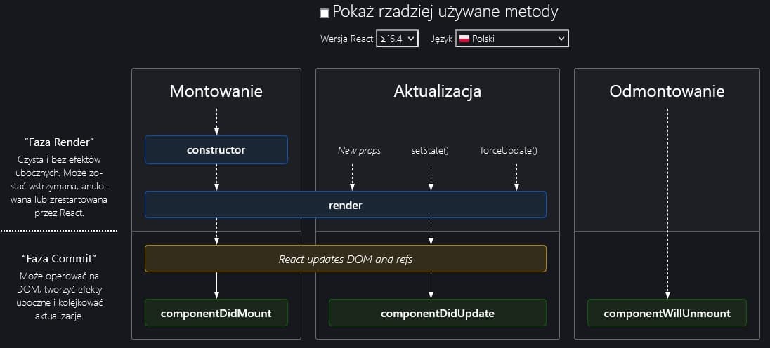 Istnieje siedem metod cyklu życiowego, pomijając render i constructor. W praktyce, do większości codziennych zadań wykorzystywane są trzy: componentDidMount, componentDidUpdate i componentWillUnmount.