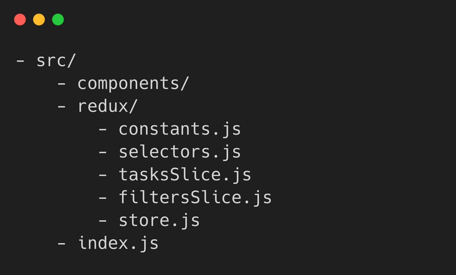 Przy projektowaniu, struktura statusu Redux dzieli się na slice'y (części), a za każdy z nich odpowiada oddzielny reducer. W naszej aplikacji menadżera zadań są dwa slice'y - zadania (tasks) i filtry (filters).