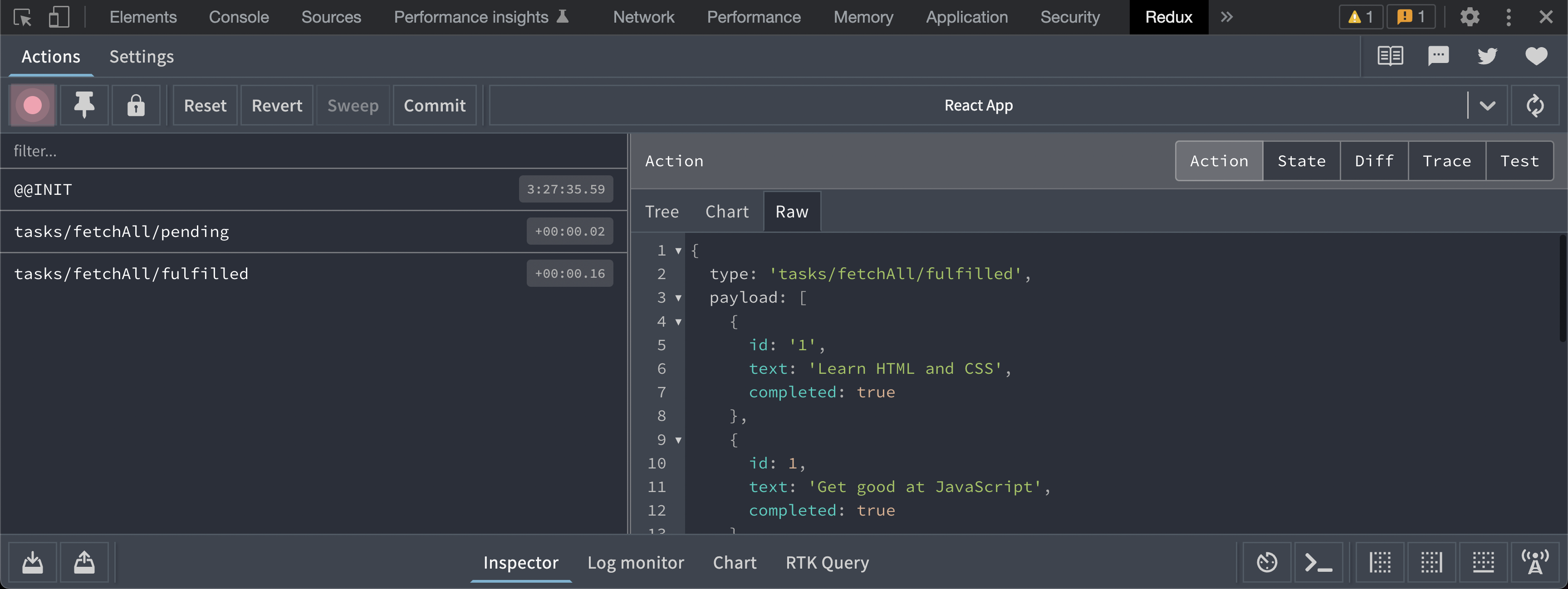 Funkcja createAsyncThunk() automatycznie tworzy akcje reprezentujące cykl życiowy zapytania HTTP i wysyła je w prawidłowym porządku, w zależności od statusu zapytania. Typ tworzonych akcji składa się z łańcucha wskazanego jako pierwszy argument ("tasks/fetchAll"), do którego dodaje się postfiksy "pending", "fulfilled" lub "rejected", w zależności od tego, jakie stany zapytania opisuje akcja.